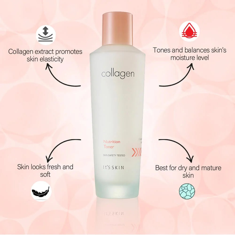 Μετά τον καθαρισμό εφαρμόζουμε μια μικρή ποσότητα Collagen nutrition toner + σ’ ένα βαμβάκι ή στις παλάμες μας. Στη συνέχεια, ταμπονάρουμε ελαφρώς μέχρι να το απορροφήσει το δέρμα. Τέλος, συνεχίζουμε με τον ορό και την κρέμα μας.